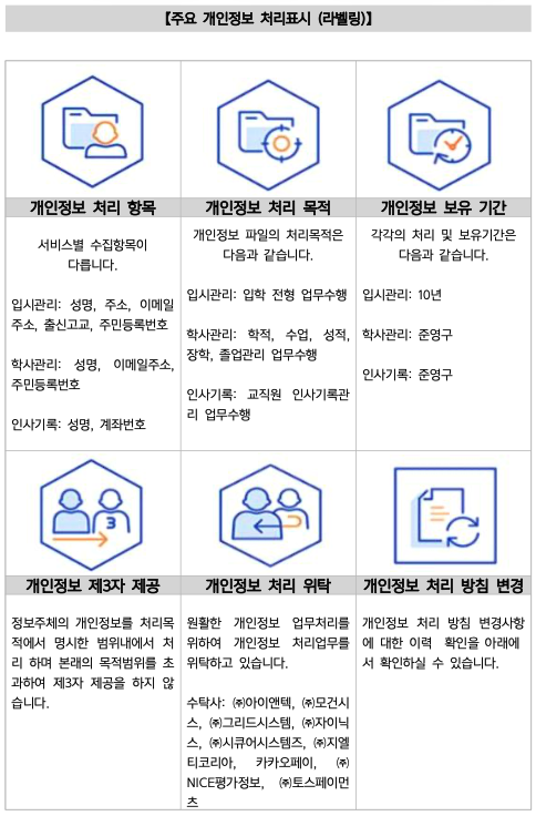| 4 | 입시지원자명단 | 고등교육법시행령 제35조(입학전형자료) / 고등교육법시행령 제73조(고유식별정보의처리) |